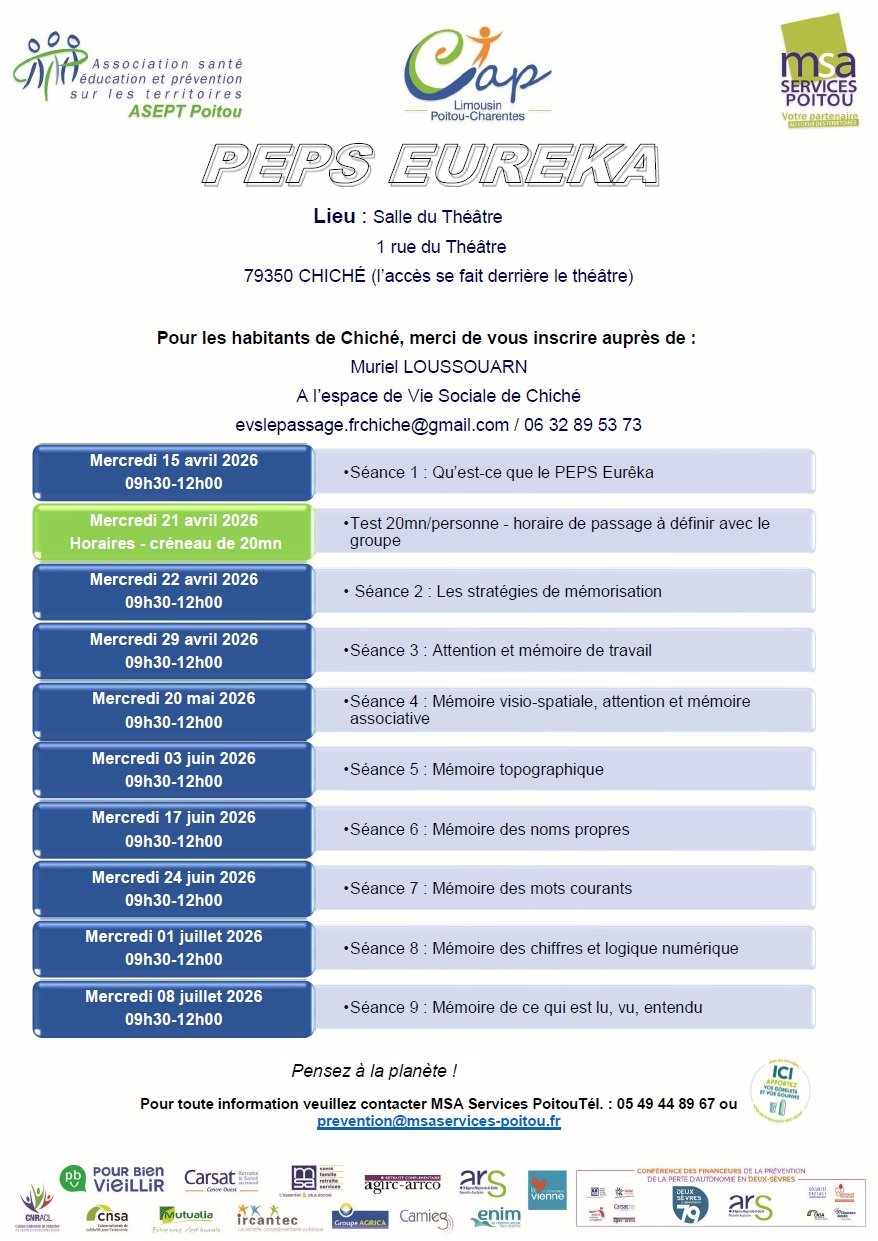 La première séance aura lieu le mercredi 15 avril 2026 de 09h30 à 12h00 à la salle du Théâtre de Chiché (1 Rue du Théâtre - 79350 CHICHÉ)