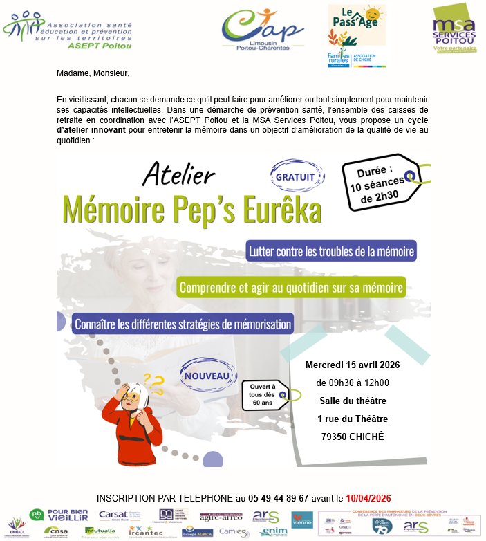 En vieillissant, chacun se demande ce qu'il peut faire pour améliorer ou tout simplement pour maintenir ses capacités intellectuelles. Dans une démarche de prévention santé, l'association MSA Services POITOU, en coordination avec l'ensemble des caisses de retraite et l'ASEPT Poitou, vous propose un atelier pour entretenir la mémoire dans un objectif d'amélioration de la qualité de vie au quotidien :