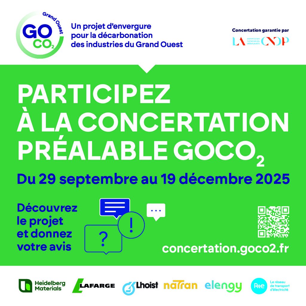 Afin d’informer et d’obtenir l’avis du public sur le projet GOCO2, une concertation préalable est organisée du 29 septembre 2025 au 19 décembre 2025 sous l’égide de la Commission nationale du débat public.