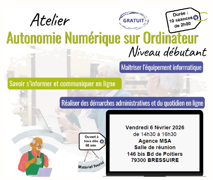 L'utilisation du numérique est devenue indispensable au quotidien (démarches administratives, lien social, informations de la commune...). Or cette dernière n'est pas aisée pour tout le monde. Afin de vous accompagner vers une autonomie numérique, l'ensemble des caisses de retraite en coordination avec l'ASEPT Poitou et la MSA Services Poitou vous propose un