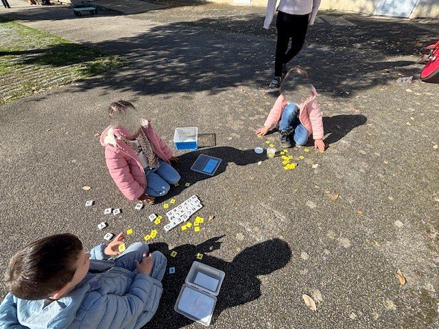 Ainsi, tous les jeudis matin, toute la classe sort dans la cour de récréation ou dans le jardin de la mairie afin de poursuivre ses apprentissages. Nous restons flexibles et apprécions chaque moment que nous offre la météo, aussi, c'est hier que nous sommes sortis profitant ainsi de ce temps magnifique.