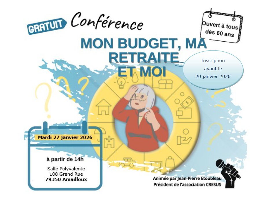 Dans un objectif de prévention, l’association MSA Services POITOU, en coordination avec le Département des Deux-Sèvres et l’ASEPT Poitou organise une conférence gratuite le mardi 27 janvier 2026 de 14h00 à 16h00 à Amailloux (Salle Polyvalente - 108 Grand Rue - 79350 AMAILLOUX).